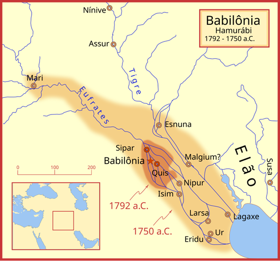 Mapa do Império Babilónico sob Hamurabi. (pt.wikipedia.org)