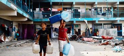 Duas crianças num abrigo escolar da Unrwa em Khan Younis, no Sul de Gaza, que vão buscar água. (Créditos fotográficos: Unrwa/Fadi – news.un.org)